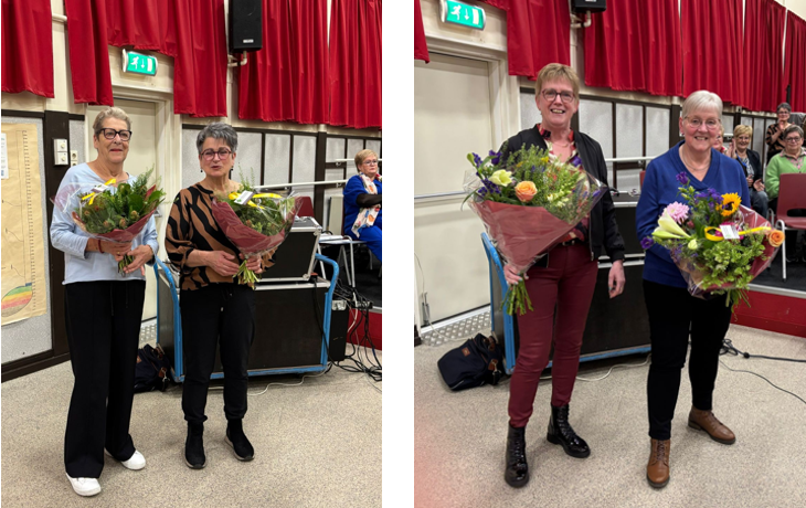 Op de intussen alweer 17e ledenvergadering van Nederpopkoor A27 werden een 4-tal dames in de bloemetjes gezet. Dat waren allereerst Tony en Lijna, omdat beide dames 12,5 jaar lid zijn van Nederpopkoor A27. Daarnaast kregen 2 bestuurdersleden Elza en Anja een bos bloemen als bedankje voor hun inzet als bestuurslid.  Elza heeft maar liefst 9 jaar in het bestuur gezeten en Anja 6 jaar. Gelukkig zijn er 2 leden bereid gevonden om het bestuur weer compleet te maken. Te weten Heleen en Corrie.